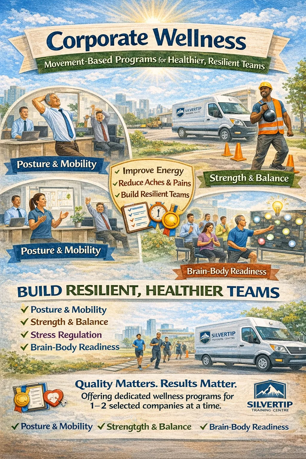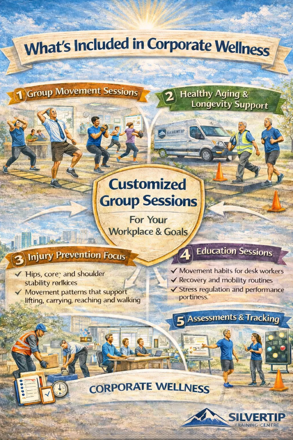 Silvertip Training Centre offers Corporate Wellness programs for companies that want more than generic “wellness perks.” If you’re looking for a practical, measurable way to improve energy, reduce aches and pains, support healthy aging in the workforce, and build resilient teams, this is built for you.