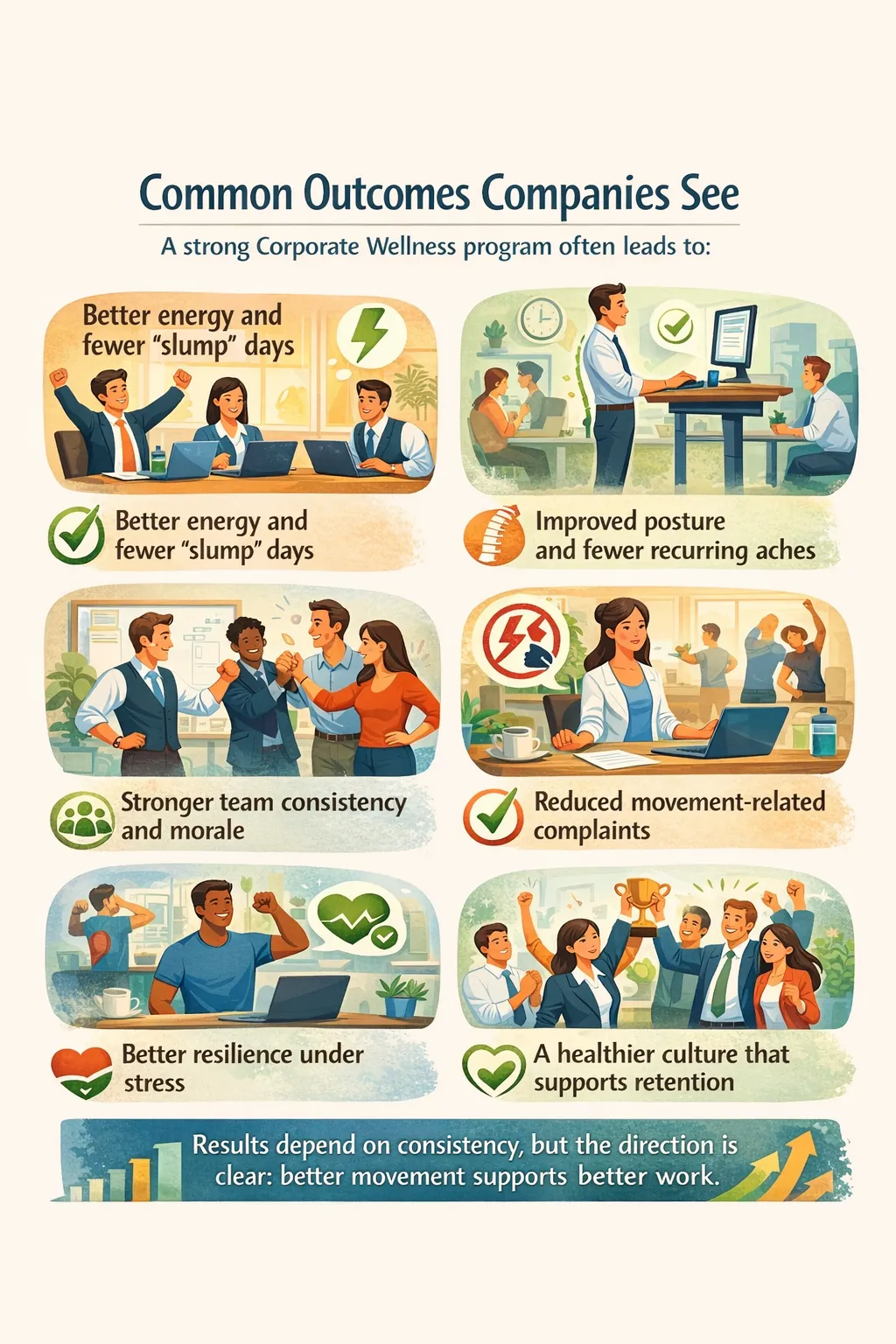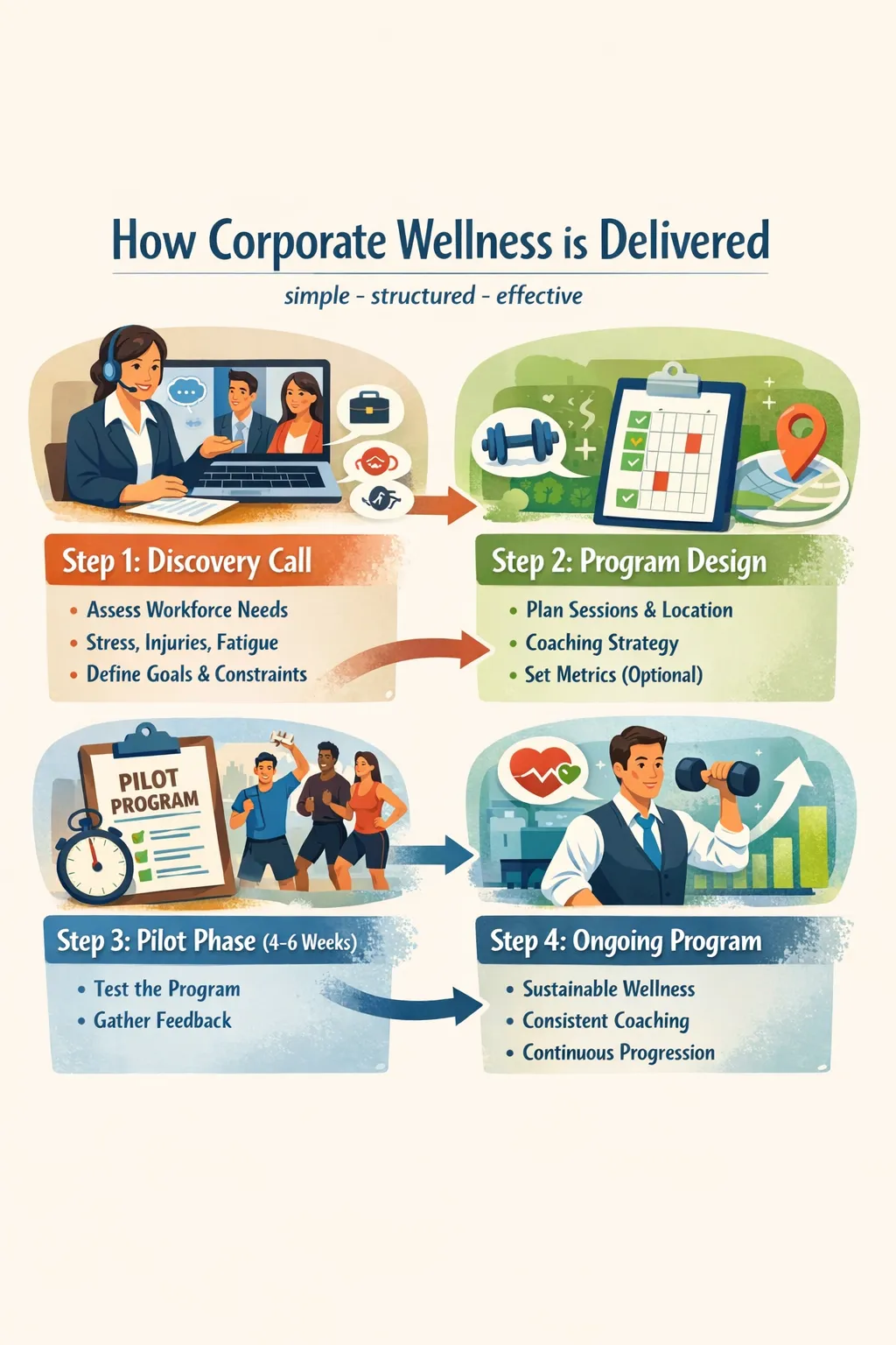 Once the pilot proves value, Corporate Wellness continues in a sustainable format with consistent coaching and progression.